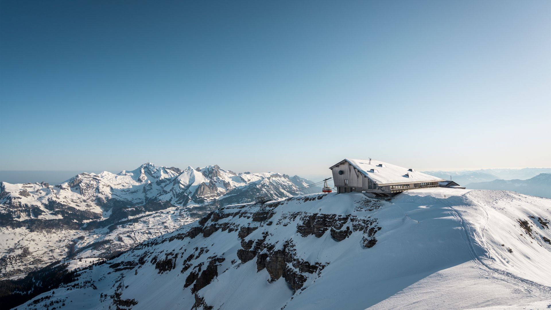Das Gipfelgebäude der bekannten Architekten Herzog & de Meuron fügt sich sanft in die Bergwelt des Toggenburgs ein und betont die einmalige Silhouette der Churfirsten. Auch die Talstation wurde von den Architekten neu gestaltet.