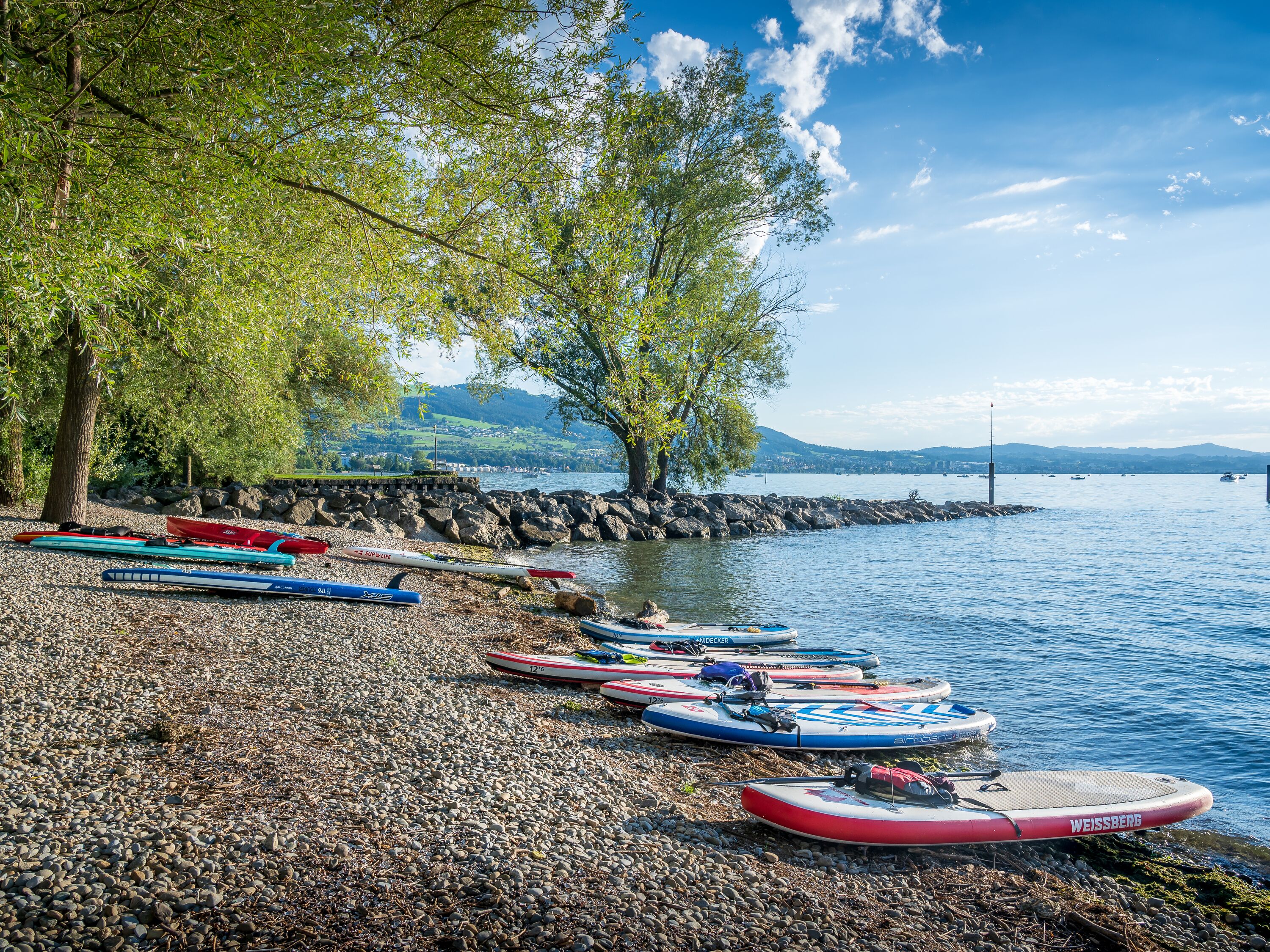 Quando il tempo è bello, il lago di Walen è ideale per i principianti del SUP. Anche il refrigerio è garantito: Il lago raramente supera i 20 gradi di temperatura. Le tavole da SUP possono essere noleggiate al campeggio Gäsi con la sua spiaggia sabbiosa a Weesen e al molo Sagi del Lofthotel der alten Spinnerei a Murg. A Weesen, potete esplorare il canale della Linth da soli con una tavola da SUP noleggiata in campeggio. Pratica: la tavola e la pagaia possono essere restituite al punto di sbarco concordato dopo aver remato.