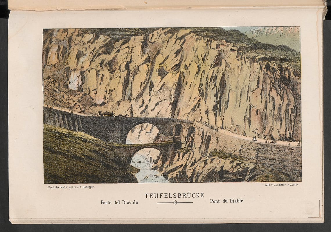 Gli urani non riuscivano a capire come costruire un ponte che superasse la gola di Schöllenen. Perplesso, il landamano urlò: «Solo il diavolo può costruire un ponte così!». Ed ecco materializzarsi il diavolo in persona, che gli rispose: «D’accordo, a condizione che il primo ad attraversare il ponte sia mio». Gli abitanti accettarono. Dopo tre giorni il miracolo era sotto gli occhi di tutti. Ma sull’altra sponda troneggiava il diavolo, in attesa della vittima che gli era stata promessa. Gli astuti urani fecero però in modo che il primo ad attraversare il ponte fosse un caprone selvatico. Il diavolo sbranò il caprone e scomparve in direzione di Göschenen, dove prese una roccia grande come una casa con l’intento di distruggere il ponte. Ma una madre coraggiosa che passava di lì tracciò il segno della croce sulla roccia, che divenne impossibile da spostare. Il diavolo scomparve in una nuvola di zolfo e da allora non si fece più vedere da quelle parti. La storia della costruzione del Ponte del diavolo viene raccontata da circa 500 anni. I veri diavoli, però, sono stati gli urani, che in realtà avevano reso attraversabile la gola di Schöllenen già 300 anni prima. Gli abitanti della Valle di Orsera, originari del Vallese, erano abituati a costruire ponti su ripidi pendii rocciosi lungo canaloni d’acqua, i cosiddetti «Suonen», e sopra le gole. E così non furono di certo costretti a chiedere aiuto al diavolo, ma affidarono semplicemente la costruzione della passerella obliqua, la cosiddetta «Twärrenbrücke», lungo la parete rocciosa Chilchbergfelsen, e del ponte di legno sulla Reuss a degli abilissimi costruttori.