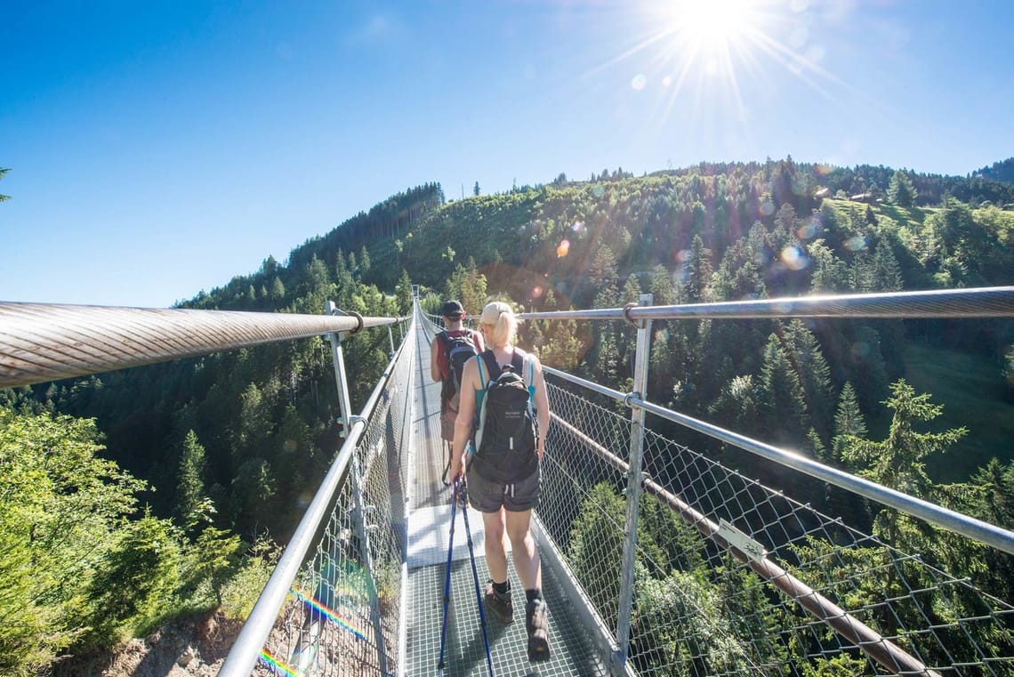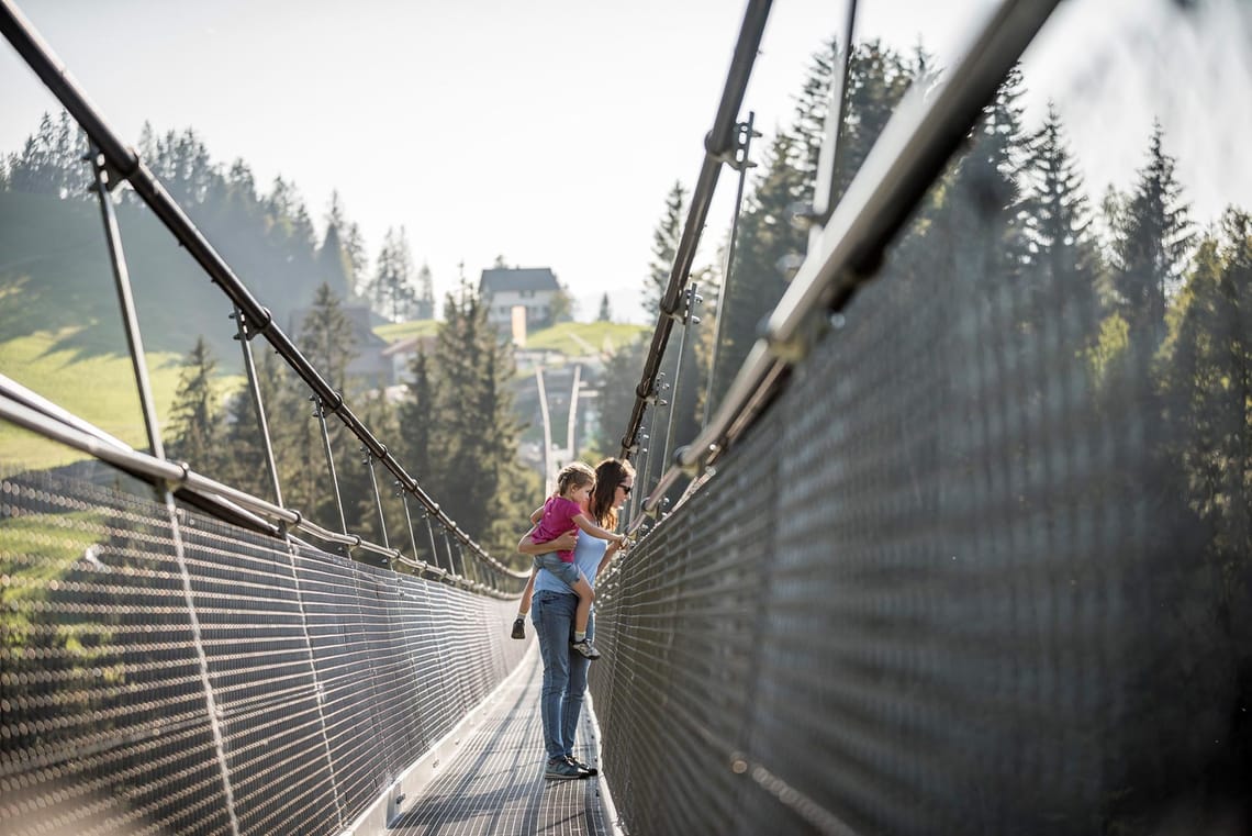 Erleben Sie auf einer der längsten Fussgänger-Hängebrücke Europas atemberaubende Augenblicke mit einem Adrenalinkick. Bis zu 58 Meter hoch erstreckt sich die 374 Meter lange Hängebrücke über das wildromantische Lauitobel. Anschliessend geht es durch Wälder und entlang von Wiesen zurück zur Bergstation, wo sich Kinder mit vielen Angeboten an der frischen Luft austoben können. Viele Rundwege, Feuerstellen und gemütliche Berggasthäuser stehen Wandernden offen, die eher Ruhe und Natur suchen.